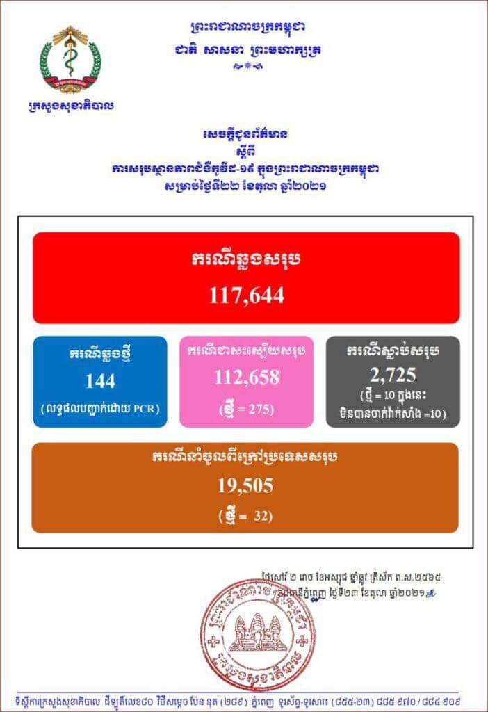 (ភ្នំពេញ)៖ ក្រសួងសុខាភិបាល នៅថ្ងៃទី២៣.១០.២០២១ បានចេញសេចក្តីប្រកាសព័ត៌មាន បញ្ជាក់ពីលទ្ធផលនៅថ្ងៃទី២២.១០.២០២១ ។