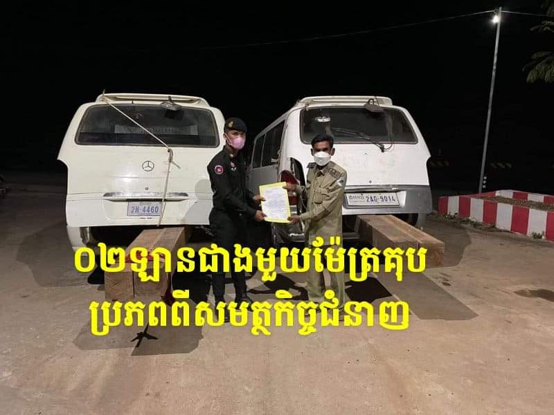 ០២.រថយន្ត​សាំ​យ៉ុង​ ពណ៌​ស​ ពាក់​ស្លាក​លេខ​ ភ្នំពេញ​ ២N​ ៤៤៦០​ ផ្ទុកឈើអាលេខ១ (ឈ្លីក-សុ​ក្រំ) -សរុប=ចំនួន​០៨ដេីម​ សុក្រំ​ចំនួន​១០ដុំ​=១,២៧២​(មួយ​ម៉ែត្រ​ត្រី​គុណ​ពី​រយ​ចិតសិប​ពីរ​)​ ចំណែក​អ្នកបើកបររត់គេចខ្លួនបាត់។ បច្ចុប្បន្ន: វត្ថុតាងខាងលេីប្រគល់​ជូន​រដ្ឋបាល​ព្រៃឈើ​ថ្ម​គ្រែ​​​ចាត់​ការ​តាម​និតិ​វិធី​ច្បាប់៕