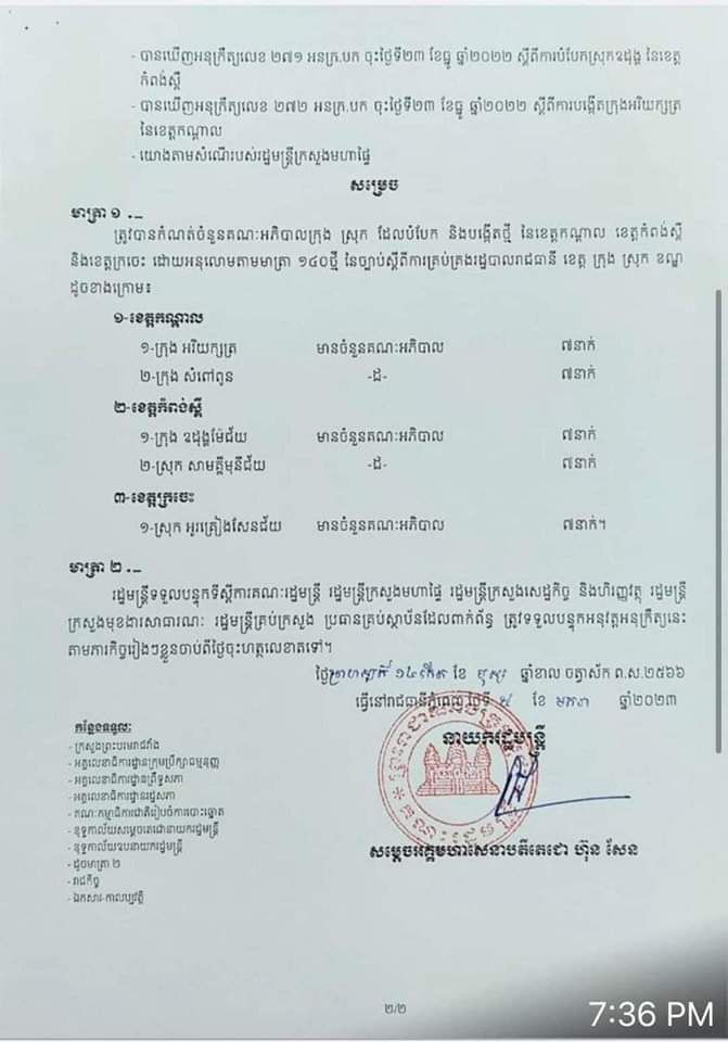 សម្តេចតេជោ ហ៊ុន សែន ប្រមុខរាជរដ្ឋាភិបាល ចេញអនុក្រឹត្យសម្រេចកំណត់ចំនួនគណៈអភិបាលក្រុង ស្រុក ដែលបំបែក និងបង្កើតថ្មីនៃខេត្តកណ្តាល ខេត្តកំពង់ស្ពឺ និងខេត្តក្រចេះ។ by admin — Jan 05, 2023 in ព័ត៌មានជាតិ 122 views comments off 20 សម្តេចតេជោ ហ៊ុន សែន ប្រមុខរាជរដ្ឋាភិបាល ចេញអនុក្រឹត្យសម្រេចកំណត់ចំនួនគណៈអភិបាលក្រុង ស្រុក ដែលបំបែក និងបង្កើតថ្មីនៃខេត្តកណ្តាល ខេត្តកំពង់ស្ពឺ និងខេត្តក្រចេះ។ Tweet on Twitter Share on Facebook Google+ Pinterest