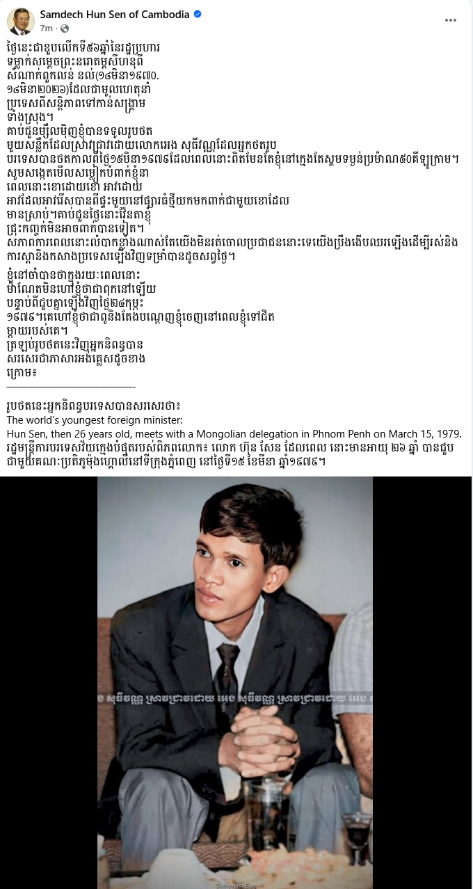 រូបថតនេះអ្នកនិពន្ធបរទេសបានសរសេរថា៖ The world’s youngest foreign minister: Hun Sen, then 26 years old, meets with a Mongolian delegation in Phnom Penh on March 15, 1979. រដ្ឋមន្ត្រីការបរទេសវ័យក្មេងបំផុតរបស់ពិភពលោក៖ លោក ហ៊ុន សែន ដែលពេល នោះមានអាយុ២៦ឆ្នាំ បានជួបជាមួយគណៈប្រតិភូម៉ុងហ្គោលីនៅទីក្រុងភ្នំពេញ នៅថ្ងៃទី១៥ ខែមីនា ឆ្នាំ១៩៧៩»៕