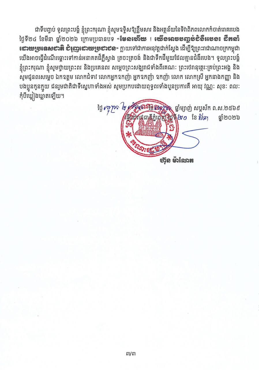 (ភ្នំពេញ)៖ សម្តេចបវរធិបតី ហ៊ុន ម៉ាណែត នាយករដ្ឋមន្ត្រីនៃកម្ពុជា បានចេញសារលិខិត ក្នុងឱកាសប្រារព្ធទិវាពិភពលោកកំចាត់រោគរបេង ក្រោមប្រធានបទ៖ «មែនហើយ ! យើងអាចបញ្ចប់ជំងឺរបេង៖ ដឹកនាំដោយប្រទេសជាតិ ជំរុញដោយប្រជាជន»។