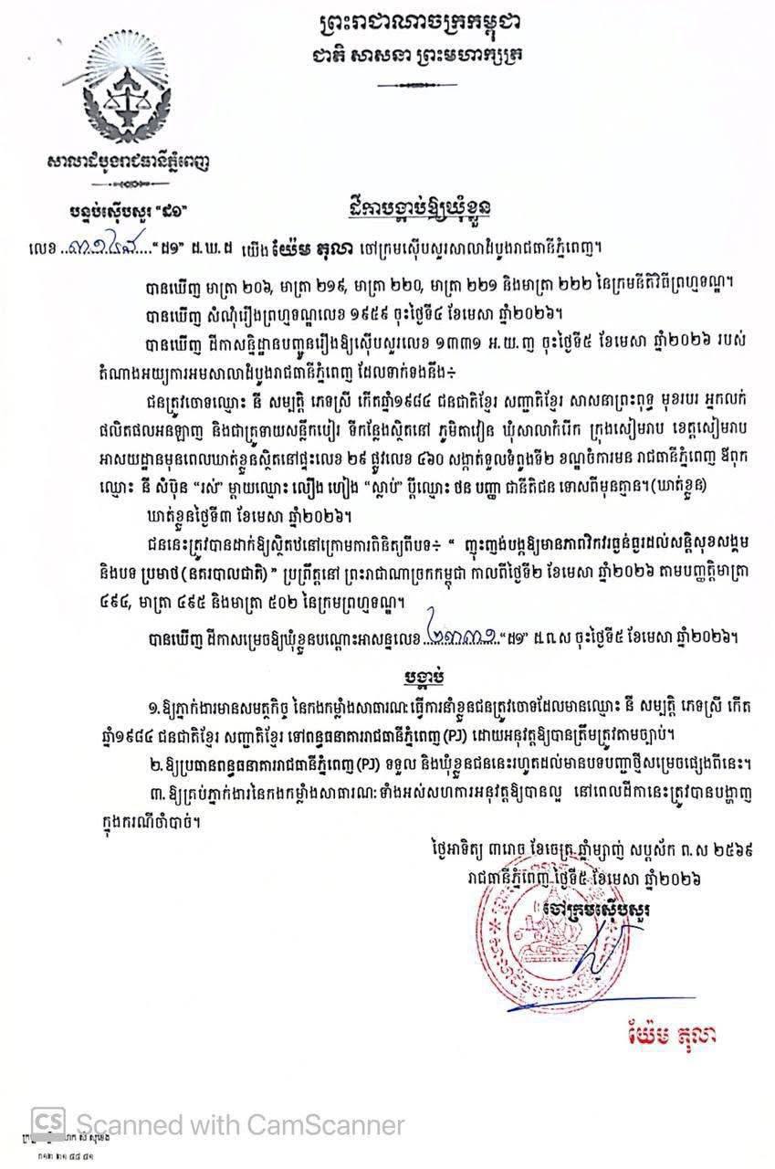 (ភ្នំពេញ)៖ សាលាដំបូងរាជធានីភ្នំពេញ ចេញដីកាបង្គាប់ឲ្យឃុំខ្លួន ស្រ្តីគ្រូទាយ «ម៉ែរក្សា» ដែលឈ្មោះ នី សម្បត្ដិ ទៅពន្ធធនាគាររាជធានីភ្នំពេញ (PJ)។ នេះបើតាមដីកាបង្គាប់ឲ្យឃុំខ្លួន ដែលបណ្ដាញព័ត៌មាន Fresh News ទទួលបាននៅថ្ងៃទី០៦ ខែមេសា ឆ្នាំ២០២៦។