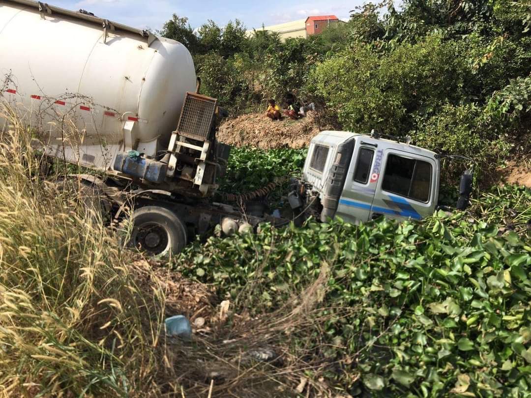 រថយន្តសណ្តោងដឹកស៊ីម៉ងត៍បើកបរជែងគ្នាមិនប្រយ័ត្នខាងមុខរ៉េចង្កូតធ្លាក់ប្រឡាយទឹកស្អុយ