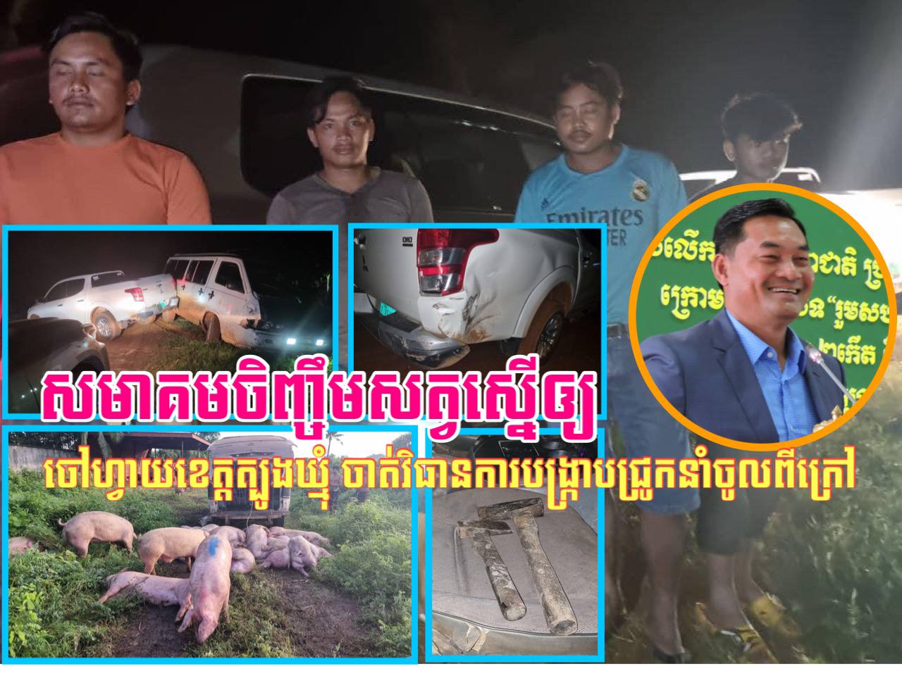 ផ្ទុះខ្លាំង សកម្មភាពបទល្មើសនាំចូលជ្រូករស់ដោយខុសច្បាប់ តាមច្រករបៀងក្នុងទឹកដីខេត្តត្បូងឃ្មុំ, ក្រុមការងារអន្ដរាគមន៍បង្រ្កាបបទល្មើស បានជនល្មើស ៤នាក់ និងវត្ថុតាងជ្រូករស់ ចំនួន ៣២ក្បាល ។ឲ